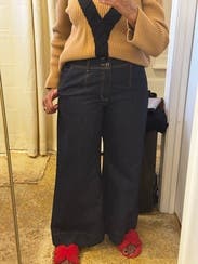 Wish I had a picture of this! Sparkly dark denim could dress up or down. Small waist and very high rise but that worked for my short trunk. A tad too long for 5’5”. Overall I wore these several times!