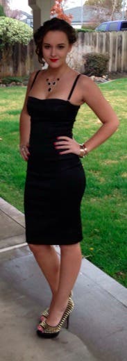 I wore this dress to a quince, under special orders from the birthday girl that I was supposed to look absolutely stunning, or I had to leave. This dress did the job better than I could have ever expected! I was a little nervous, as this was my first rental, and I wasn't completely sure how to accessorize it. I wore the dress with a pair of peep toe, gold spiked Vince Camuto heels, gold bangles, a gold two finger ring, and the black necklace shown in the second picture. In my opinion, it all came together beautifully. I had several people compliment me throughout the night. The dress was great for dancing, i wasn't nervous chowing down in it, and it stayed in place beautifully. I did use some fashion tape to hold the bralette part in place, but that was purely for my own piece of mind. I read some reviews say that the zipper slid down in the back a little throughout the night, but thankfully I didn't have this problem. Overall, I had a wonderful experience and will absolutely rent again! (Maybe even this dress.. Gosh I love this dress!)