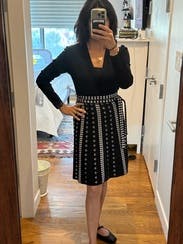 This dress for well and was bust and tummy friendly. Would buy (a size smaller) if is available in a future sale! Worn to a Hill holiday party.