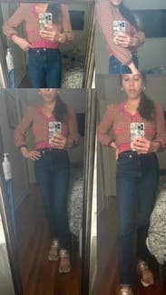 Love this and its color combo!! The neckline is so flattering and loved the excess fabric on the arms. It is cropped, which I knew, but just be wary if you’re not expecting. I have a belly and wore with high waisted jeans but felt so good in it! Will definitely consider buying. Wore to work and everyday wear.