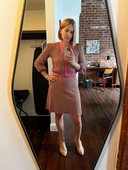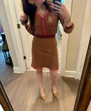 I love DVF and the way her clothes fit me, the fun prints, and colors. I saw this and instantly fell in love with it, it was giving Boss Barbie vibes and I wanted it. Unfortunately wearing it isn’t as fun as looking at it because for me it creates a bulk on my waist that creates a top heavy appearance with my top half bigger than the bottom half, I think it’s the sweater like fabric and pockets that cause it to bulge out and with the cropped length it’s just not super flattering for my shape. I love the print and color and as far as the top half, I’m loving the look on Teams calls at work but as for going out I felt self conscious about my midsection.