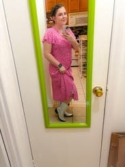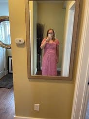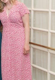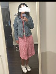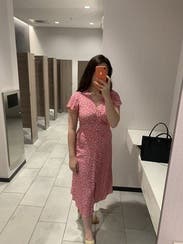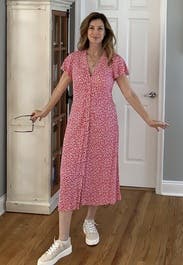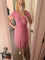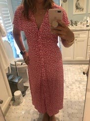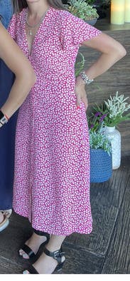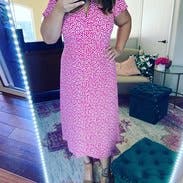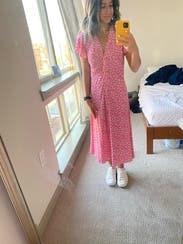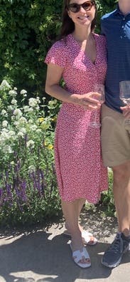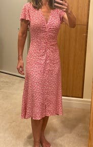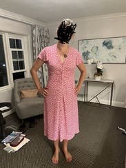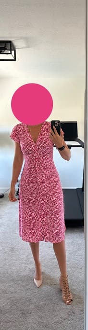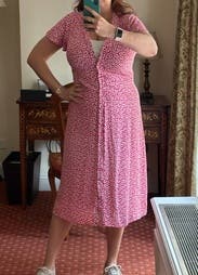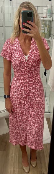 This dress was super comfy. I wore it to work, followed by a dinner with friends. The negatives for me is the vneck is cut a bit weird and if I leaned forward at a certain angle it exposes your chest a bit. I thought it looked cute on, but in the photos of me wearing it, it does give off matronly vibes. Beautiful colors and a decent item. Unsure if I’d rent again!