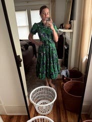 Fun dress. Super full skirt- almost hard to walk in or go to the bathroom because it was so full. Pretty pattern. Waist a bit too high and tended to ride up when sitting which was not comfortable.