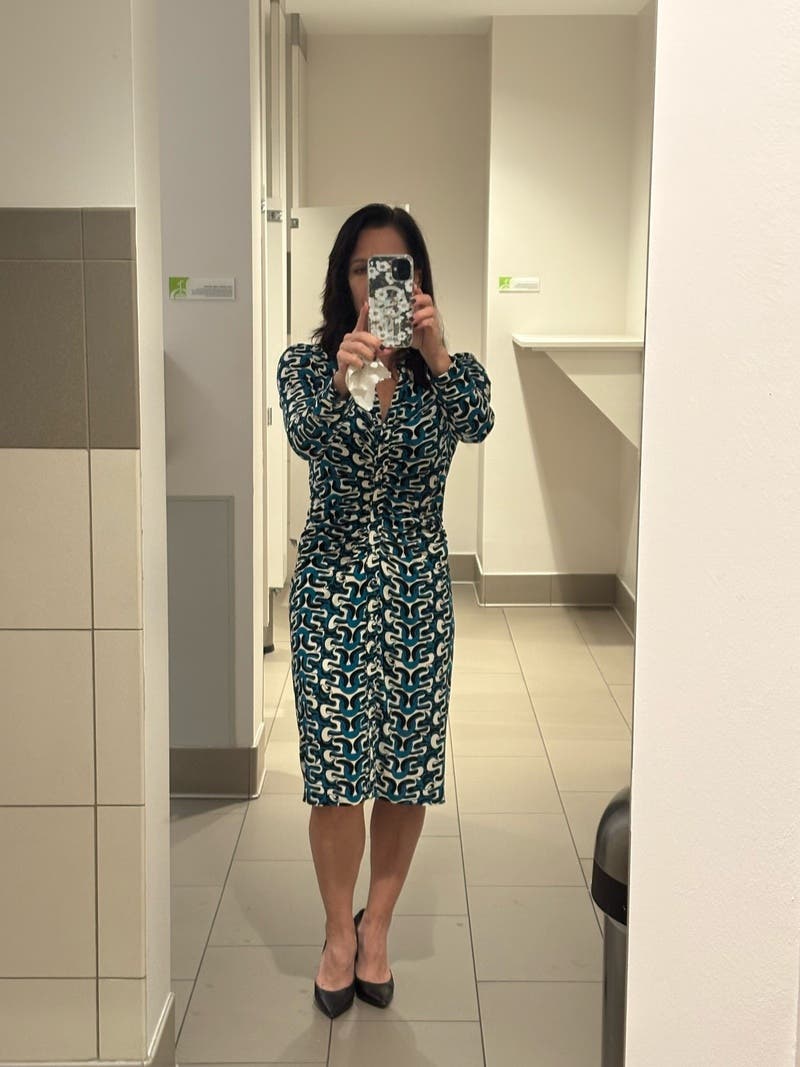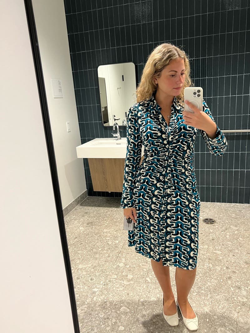 This Diane von Furstenberg dress features a bold, abstract print with a flattering wrap design and cinched waist. It exudes a vibrant and modern feel. Pair with simple heels and minimal jewelry to let the pattern stand out.