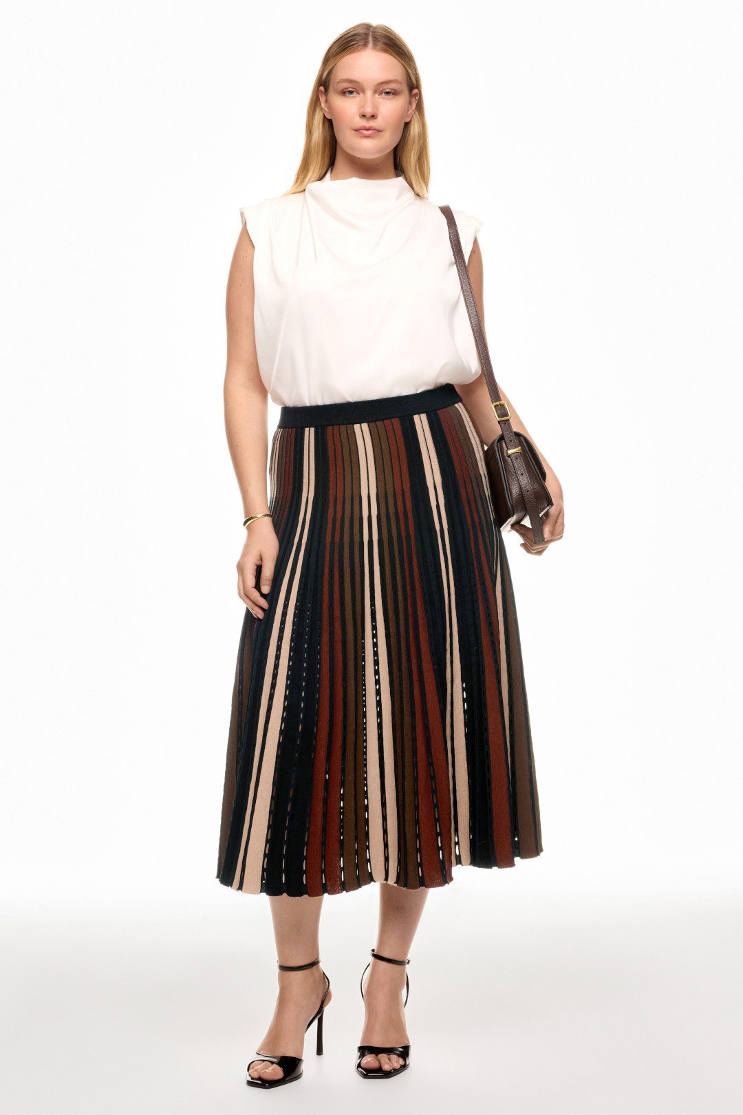 This pleated midi skirt by Diane von Furstenberg exudes sophistication with its earthy tones and vertical stripes. Pair with a sleek blouse and strappy heels for an effortlessly chic look.