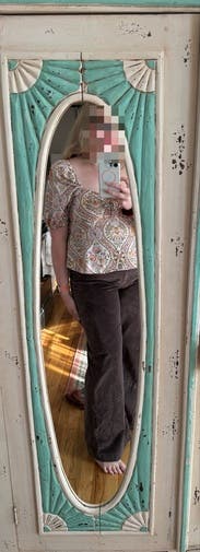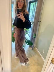 Chic oversized pants, lovely velvety texture. Slightly large but definitely not enough to me to size down.