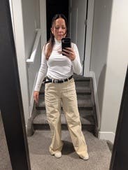 These pant went with a lot as they are still neutral. While they are wide, this was very complimentary. I would have bought them if I knew I could keep them clean :).