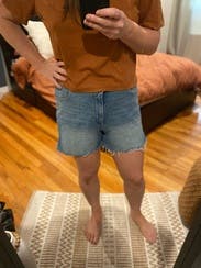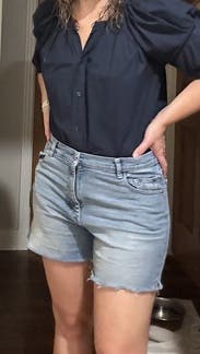 Perfect length, perfect fit in the waist (even postpartum), not too tight on the thighs. Been searching for the perfect Jean short and this is it! Will likely buy!