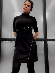 This black dress is effortlessly flattering. The gold button detail adds a modern edge while slimming the waist. Comfortable, polished, and versatile—perfect for both work and evening wear. Serious closet keeper.