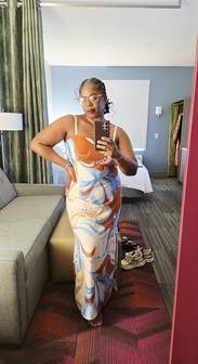 the material isn’t the best quality TBH but i did appreciate that it was thin because i wore this to a beachside wedding! fit perfectly and i got SO many compliments on this dress. perfect for any tropical destination wedding and easy to accessorize.