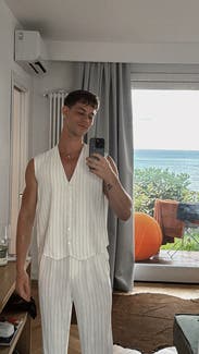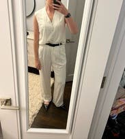Rented the pants and vest and wore it to work under a blue blazer. I really like the slouchy look, had to add a belt to keep the pants high enough to tuck in the vest. Pants were a tad too see through for my office culture, so I wore long Spanx underneath. Very wrinkly after a 2 hour meeting, but I think it looks fine with the oversize vibe. I am 5'9 and expected the pants to be long due to the other reviews but I had to wear ballet flats with them.