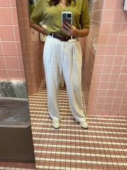 Wore these to work, despite them really being like lounge wear. The fabric and the pin stripe dress them up. But they were so big! Wore with a belt but should have definitely sized down. Also they were super long and I’m pretty tall. Wore with platforms so it was fine
