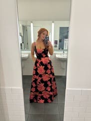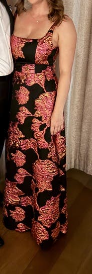 I wore this dress to a non-profit gala, and received SO many compliments. I had compliments saying the dress was made for me and I should keep it. It has pockets, is flowy, and hugs in all the right places. One big note, the pattern color is metallic pink and orange/rust which isn't captured in the photos. Definitely a favorite and would consider purchasing based on the compliments, fit, and POCKETS!