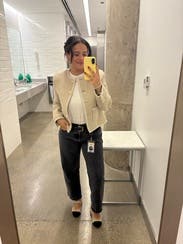 I loved this jacket and received so many compliments! Wore it to the office, as well as out for dinner. It is on the heavier side and is a bit boxy, but that’s what I liked about it! If you are in between sizes, I’d size down.