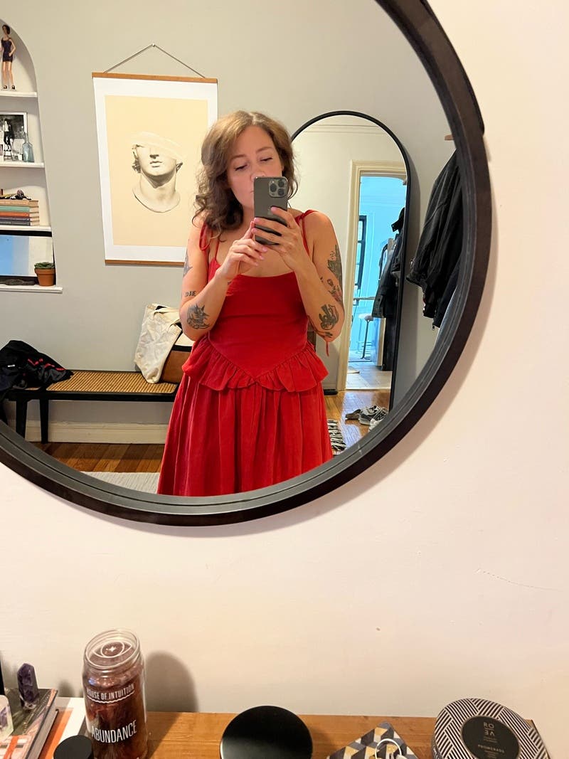 This vibrant red midi dress by Eliza Faulkner features playful tie straps and a flirty ruffled waist, emanating a cheerful and feminine vibe. Pair it with strappy heels and minimal jewelry to let the dress make a statement.