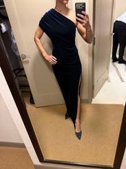 Really flattering, perfect for a wedding. Velvet dark navy with a fun slit, not too high. Got lots of compliments. Not tight, able to sit and dance without issue