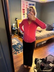 This was a fun pink color to wear. Comfortable top and could be unbuttoned later in pregnancy with a tank top.