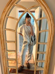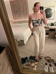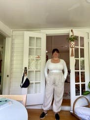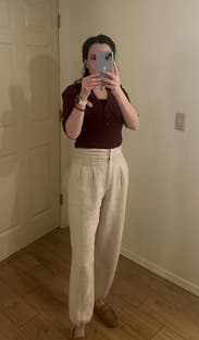 The linen material, high waist, and tie-adjustable legs are unique. The fit is a little baggy around the hips and thighs, which could be flattering or overwhelming depending on whether you’re petite and what type of top you wear. I wore a fitted tucked in top that looked nice for work