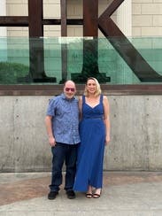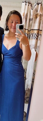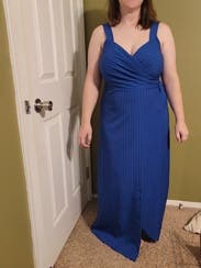 This dress is amazing! It's so flattering on, and I love the color and pinstripes. The straps are a little long, but nothing a little pinning can't fix. I'm a bit of a shortie, so it was much longer on me than the model. (This picture was taken in bare feet.) But with heels, it was perfect for a wedding!