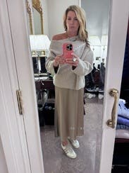 This sweater is gorgeous, but hot! Thank goodness I had a shoulder out! Paired it with a taupe satin skirt and thought it looked great together. Just don’t go dancing!