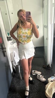 Love the little bow details and the fact it's a skort. The waist was a little loose but I think sizing down would have been too tight. The only weird part of the skirt is when you're sitting the front panel stays long while the shirts ride up so it looks like a little square covering your front...just something to note. Also if it wrinkles it REALLY doesn't unwrinkle easily.