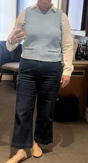 Wore with a puffed mid-sleeve collared button down, raw hem wide leg jeans, and gold flats. Got loads of compliments. It's a thicker vest so perfect for the spring!