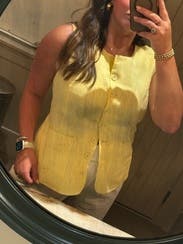 Yellow (55% Linen, 45% Rayon; Lining: 80% Polyester, 20% Cotton) Top. Crew neck. Sleeveless. Front button closure. Shoulder to hemline length: 24". Imported.