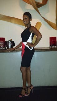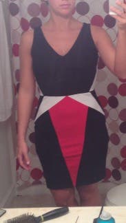 The dress is pretty and the colored shapes really make for a fun and body-friendly dress. However, it was quite form-fitting and def requires good posture. The dress did not look cute when I sat down during the evening. Overall, it's a nice dress.