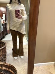 I love the unique cut of this sweater, and the length was perfect. The neck fit great and overall it’s comfortable. My only complaint was that the way the stripes come across the front made me look wider than I am.