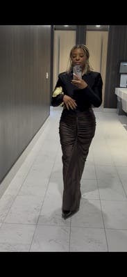 This dress is beautiful. It gives 80s glam vibes but feels modern at the same time. I was thrown off by the shoulder pads at first (didn’t read the full description before renting) but ended up loving them. The dress is flattering in hourglass figures and would likely be very flattering on pear shapes also. The ruching and gathering down the skirt is so pretty. The jersey material is very comfty and forgiving and the dress is really easy to put on and take off (you don’t need help with the zipper).