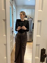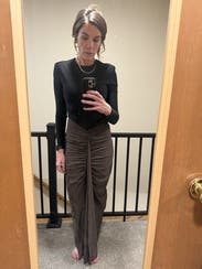 I wish I had more occasions to wear this as it fit like a dream and flowed like chocolate. I had a work event where the dress code was symphony soirée. No idea what that meant, but this fit the bill. The material is very soft and the skirt half isn’t too heavy. I wore the size 0 and the shoulder area (shoulder pads were doing work) and waist section were a little loose (25” waist), but given how form fitting everything else was it didn’t look big and the proportions were perfect. I’m 5,6” and wore 3” heels with the dress, which I thought was the right height; the dress didn’t drag and flowed nicely.