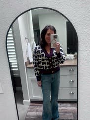 The perfect boot cut jeans for fall that I have all over my Pinterest. Would probably buy if I didn’t have so many pairs of jeans already 😅make the booty look great and really good for longer legs / tall gals!
