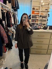 Pardon the pic in the airport bathroom (lol) - but this blazer is amazing! I’m between a 2 & 4 (I lean more 4 than 2) - I went with a 4. It’s perfectly oversized (aka doesn’t pull inward at the waist when buttoned - keeps its intended shape). Perfect for work or upscale casual - I’m wearing it with black jeans & booties but intend to wear it with dress pants and heels as well. Super cute & tempted to buy!