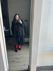 What a gorgeous, unique design. I actually said “wow” when I looked in the mirror. Always a great feeling! I’m tall, long waisted, broad shoulders & long arms. The sleeves were a bit short & I prefer coats that are longer on me, but I still loved it. Deducted a star because it does attract lint, and lack of functional pockets. Stunner, though. Reserve it if you have to. Rent it. Now.