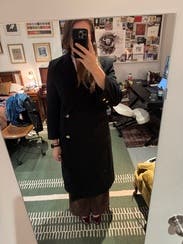 This coat is beautifully designed. An elevated classic black coat, thanks to being double breasted and the gold buttons. I wore it a ton and felt it elevated even a hoodie and jeans, but will say it attracts lint like crazy and I think that's what prevented me from buying it. It was always in need of a lint rollers assistance.