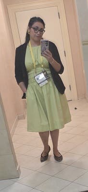 Wore this to work and then a work event that night. Loved the color and the cinched waist. It was a little long/awkward on where it hit my leg though when I was wearing sandals instead of heels. Lightweight too so good for summer!