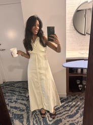 Loved this chic take on a classic shirtdress. It has a unique wrap detail that you can tie in the front or back. I would say this fits true to size, but recommend sizing up if you have a larger bust. The wrap detail on the bust doesn't cover my total bust fullness, but it's just an overlay detail. Really nice off white/ lighter beige color that doesn't wash me out! I'm 5'5" and wearing a little heel. Shorter ladies I would recommend also wearing a slight heel/ platform sandal.