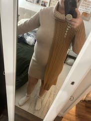 Great sweater dress with a unique flair. Got many compliments. VERY WARM. Was only able to wear it once because the fall turned warm. Personally wish I went up a size because I would have preferred it less fitted.