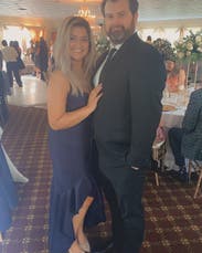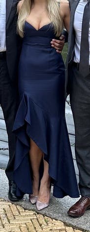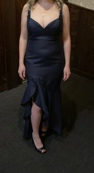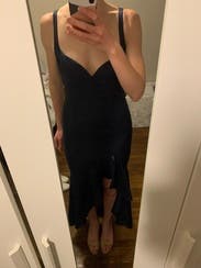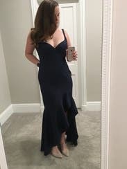 I loved the look of this dress, very classy. Be mindful that there is NO stretch to this. So if you want to be able to get the dress over your bottom and be able to sit, I recommend sizing up. Worn with a plunge bra as it does cut very low.