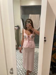 A lovely pink dress. I loved the flower detail and the tying on top. Some things to consider: It was tight around the butt and legs in a flattering way, but it made it hard to sit on the floor. The dress also wrinkles easily on the bottom.