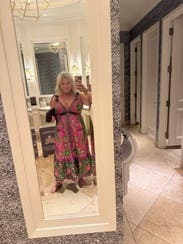 The color is insane in real life. Saturated and bright. When I opened the bag I audibly gasped at how bright and pretty this dress is! It was kind of a last min pick to fill the last spot. So a happy accident. It fit well bc the straps can be tied to adjust until it’s perfect. It does get a tiny bit wrinkled but it’s such a vacation type dress it didn’t bother me and I could have easily steamed them out quickly. I didn’t bother bc the pattern hides wrinkles. I’m renting it again for my vacation. Oh and the skirt will hide a bump so if you eat too much your tummy will still be very comfortable or you can hide any tummy without it being obvious.