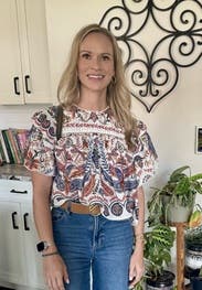 I always love Farm Rio and this top did not disappoint! It is the perfect fall transition top still has brighter colors but muted at the same time. Absolutely loved for work and I love that it’s a loose top!