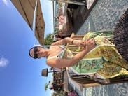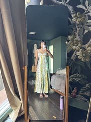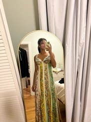 Wearing this is an experience beyond just a dress. The panels are tapered to highlight your waist as well as swirl around your body as you walk. I originally rented a medium as I thought I’d need the room in the bust, but it was too big so I rented a small the 2nd time around. The fit was perfect this time. I really appreciate the rubber strips placed on the inside of the straps to keep them from slipping off your shoulders. Good length for petites as I only needed a 2” heel to keep it from touching the ground. The medium weight fabric helps keep it from wrinkling so I was able to wear it right out of the suitcase without ironing. Perfect for dinner at the beach or a tropical vacation.