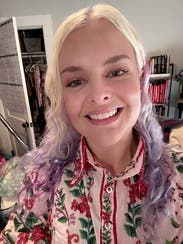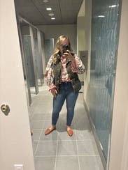 Light cotton printed blouse that I believe would look good on any palette. She’s game for jeans or dressed up. Loved her.