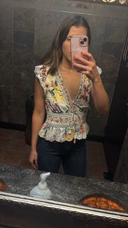 This top is borderline my style but I actually loved it. It definitely needed sticky tape to bring the chest together bc very low cut. May not be best if you have a larger chest. I also wore to work with a tank underneath which looked cute too