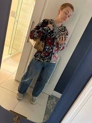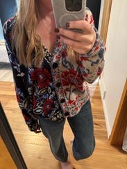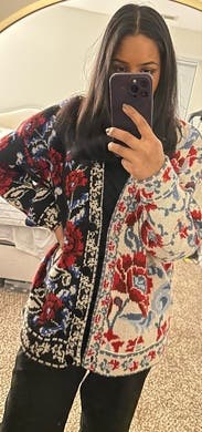 I size down in FR sweaters and wear my normal size in cardigans. Love how their bold prints elevate everyday pieces. Would have bought it but it’s not my usual color palette.
