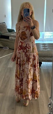 Obsessed with Farm Rio and was delighted to receive this beautiful piece with tags. It was so comfy, and was perfect for a summer dinner at an outdoor restaurant. Took me a minute to figure out the straps and needed help to tie. Great length, very breathable, just a little loose in the waist. Wore silicone bra covers since it was strappy and backless.