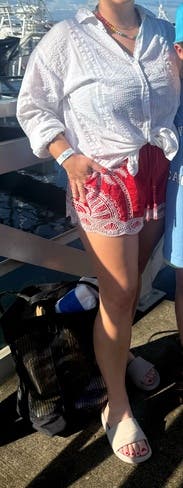 I wore this to run errands but it made me feel like I was on vacation! The netting / yarn part is super pretty and almost feels handmade. Pockets are great. Shorts ran small on me and were very tight in the waist and pinching into me so def size up!