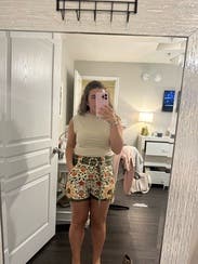 I have never received so many compliments on a pair of shorts, so that should convince you enough to rent. I kept these for a couple of months. I did size up based on reviews but wish I hadn’t as they were too big. I still made it work though, especially because this size was the only size available at the time- and the extra space translated to a longer length and plenty of room for those heavy meals. Would buy if I had my correct size.