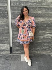 I wore this on vacation and it was great. Comfortable and a good length. It's a super fun pattern but has plenty of detailing on it (beading, waistband, and puff sleeves) to give it an elevated look. Could have worm with heels to dinner or sneakers during the day.